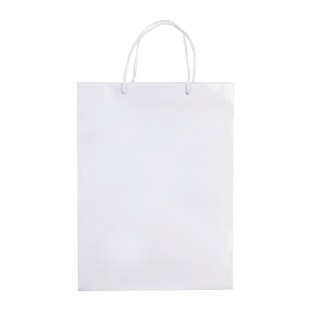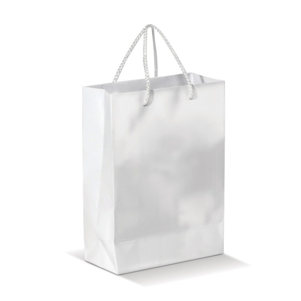 Große Papiertüte mit Seilgriffen. Erhältlich in mehreren Farben mit weißen/schwarzen Griffen. Große Druckfläche auf beiden Seiten. Starke Tasche. Glänzende Laminierung.