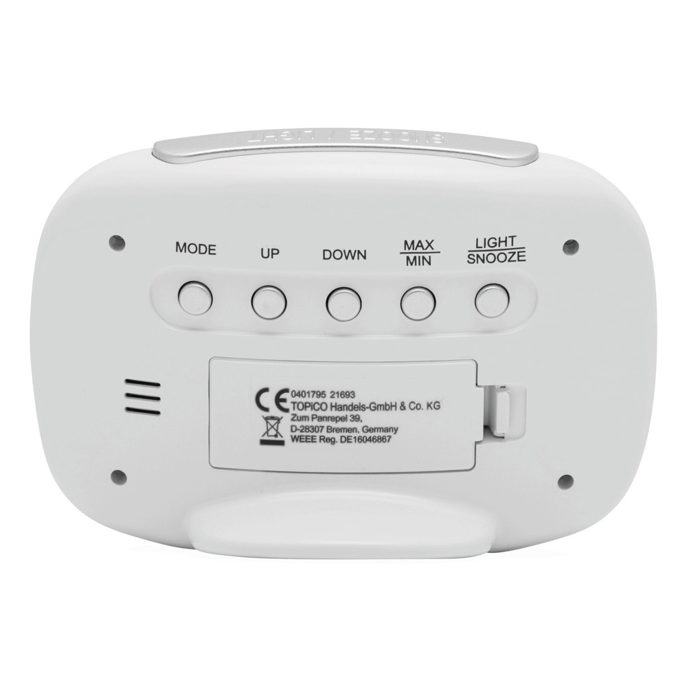Wetterstation CALOR: mit Uhrzeit-, Temperatur- (Thermometer), Luftdruck- und Luftfeuchtigkeitsanzeige (Hygrometer), Snoozefunktion, Display mit blauer Hintergrundbeleuchtung, aus weißem ABS-Kunststoff