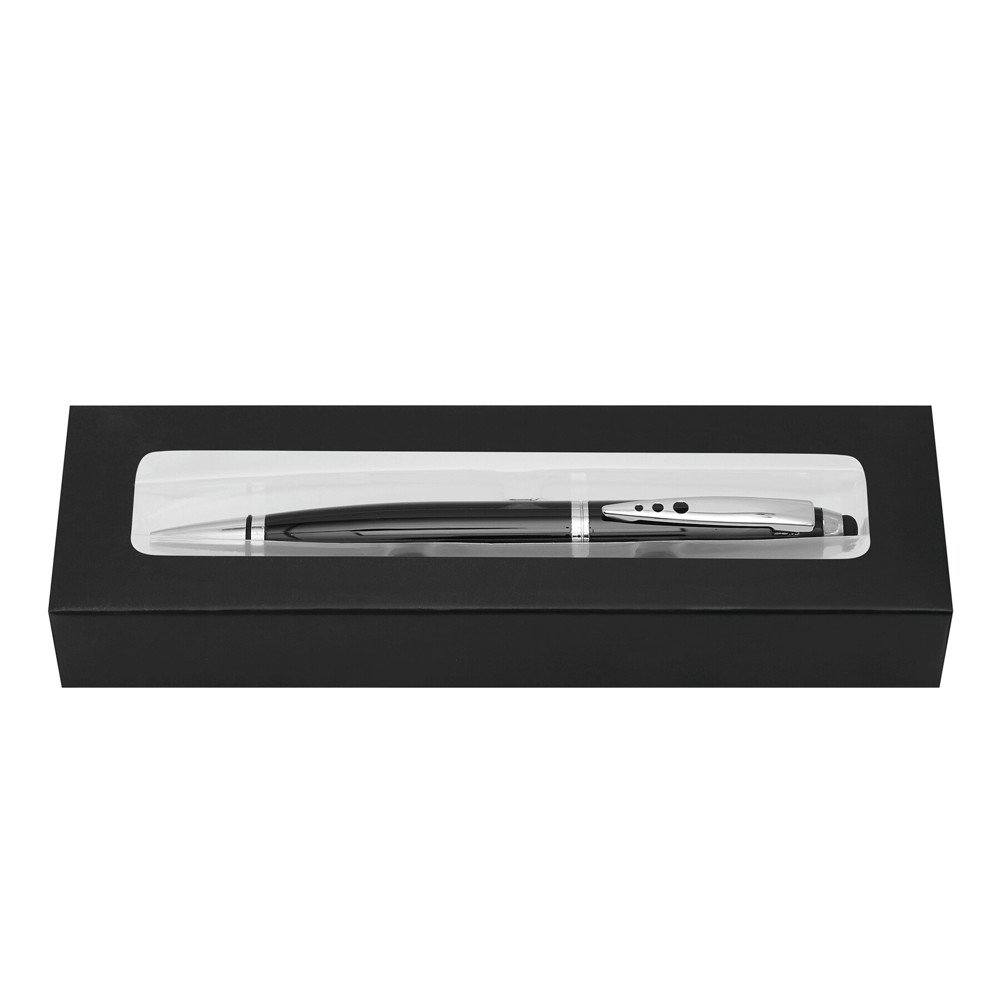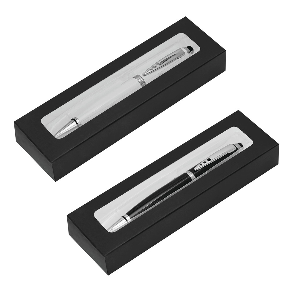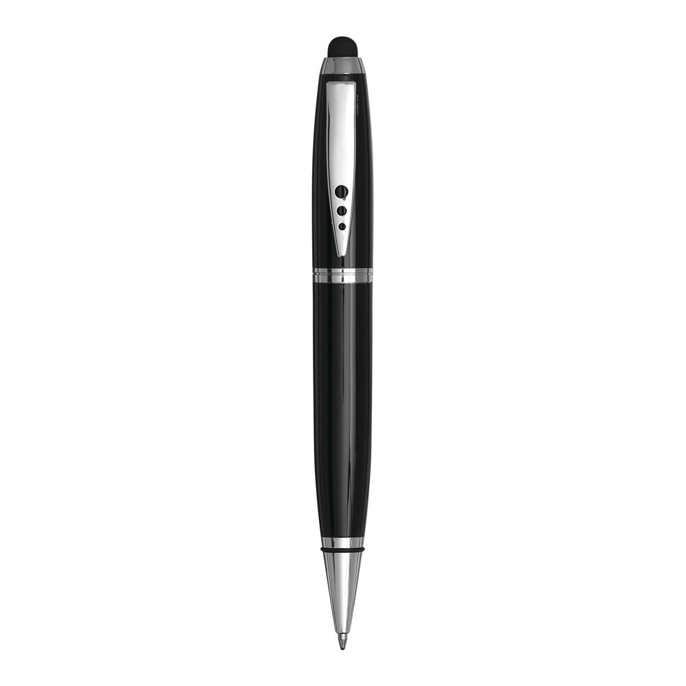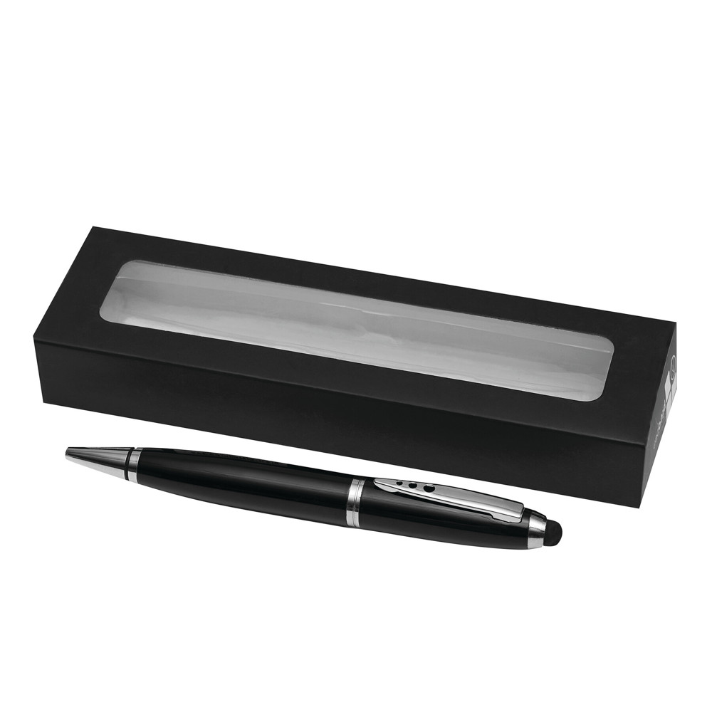 Edelstahl-Kugelschreiber TOUCH DOWN: mit Großraummine und Drehmechanismus, Touchscreen-Spitze am Schaftende, in Klavierlack-Optik und mit silbernen Dekorelementen, Clip im PiCOWORLD-Design, schwarzschreibend, Lieferung in Geschenkbox