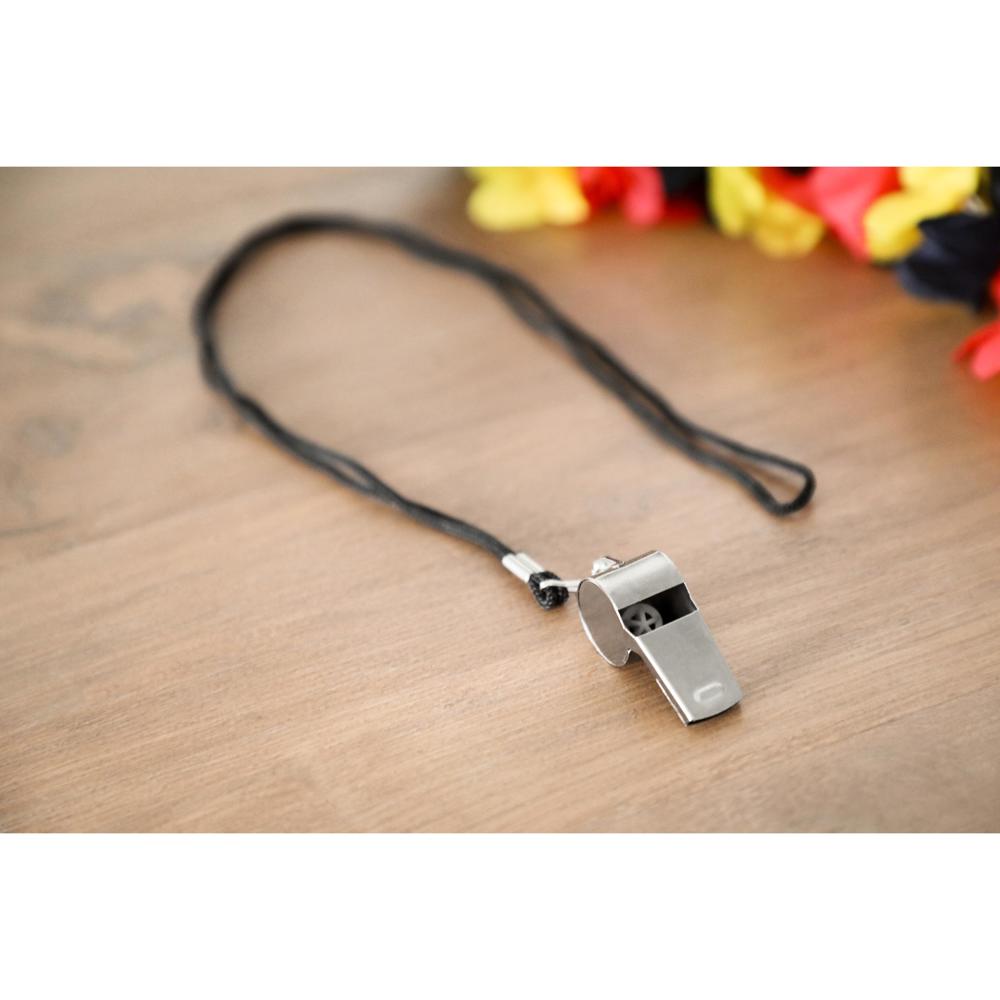 Robuste Trillerpfeife aus Metall mit lautem, klaren Signalton. Ideal für Sport, Schule oder Outdoor. Mit praktischer Kordel (46 cm) zum Tragen um den Hals oder am Handgelenk.
