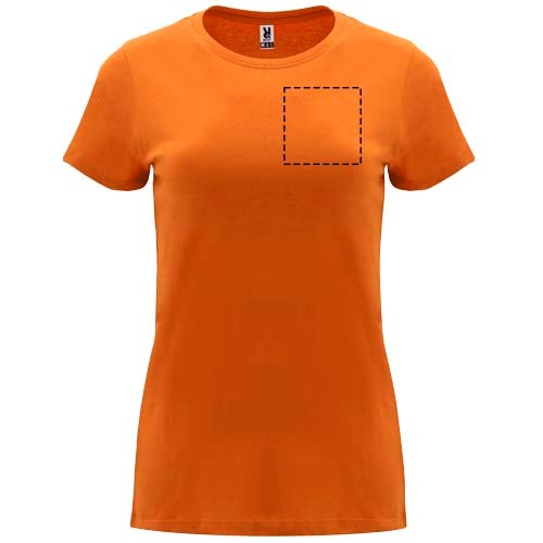Tailliertes kurzärmeliges T-Shirt für Damen. Rundhalsausschnitt mit 1×1 Rippstrick. Verstärkte und verdeckte Nähte am Kragen. Herausnehmbares Etikett.