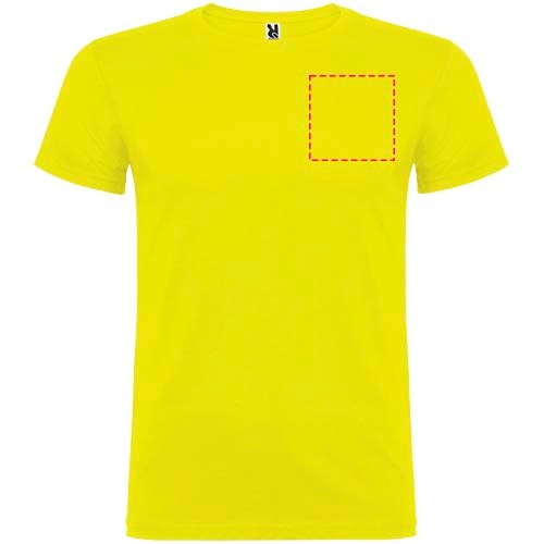 Kurzärmeliges T-Shirt mit doppellagigem Rundhalsausschnitt aus Elasthan, hergestellt aus schlauchförmigem Material für Erwachsene. Verstärkte und verdeckte Nähte am Kragen. Herausnehmbares Etikett. Das Modell ist 190 cm groß und trägt Größe L.