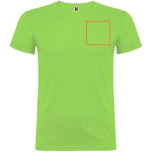 Kurzärmeliges T-Shirt mit doppellagigem Rundhalsausschnitt aus Elasthan, hergestellt aus schlauchförmigem Material für Erwachsene. Verstärkte und verdeckte Nähte am Kragen. Herausnehmbares Etikett. Das Modell ist 190 cm groß und trägt Größe L.