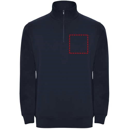 Sweatshirt mit passendem halben Reißverschluss und Polokragen. Passender Innenkragen. Verstärkte, abgedeckte Nähte am Innenkragen. 1×1 Rippbündchen an Ärmeln und Taille. Das Modell ist 185 cm groß und trägt Größe M.