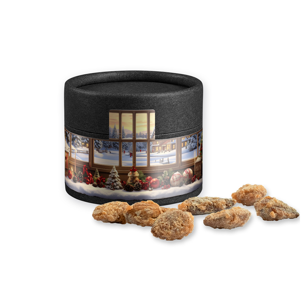 Kraftpapierdose Mini schwarz aus Papier. Werbeanbringung als Etikett in 4c individuell bedruckbar.