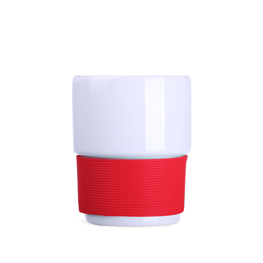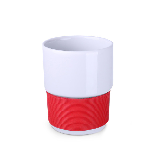 Mittelgroßer Werbebecher aus Keramik ohne Henkel. Die 40 mm breiten Bänder sind in verschiedenen Farben erhältlich: weiß, orange, rot, marineblau, braun und schwarz.