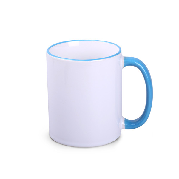 Ein außergewöhnlich farbenfroher Sublimationsbecher mit einer einfachen Form. Perfekt für das Aufbringen von Drucken in Fotoqualität. Das Besondere daran sind die in vielen Farben gefärbten Felgen und Ohren.