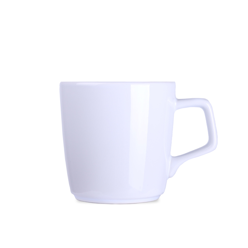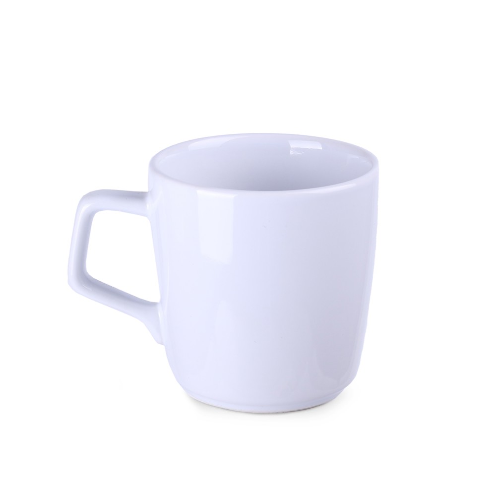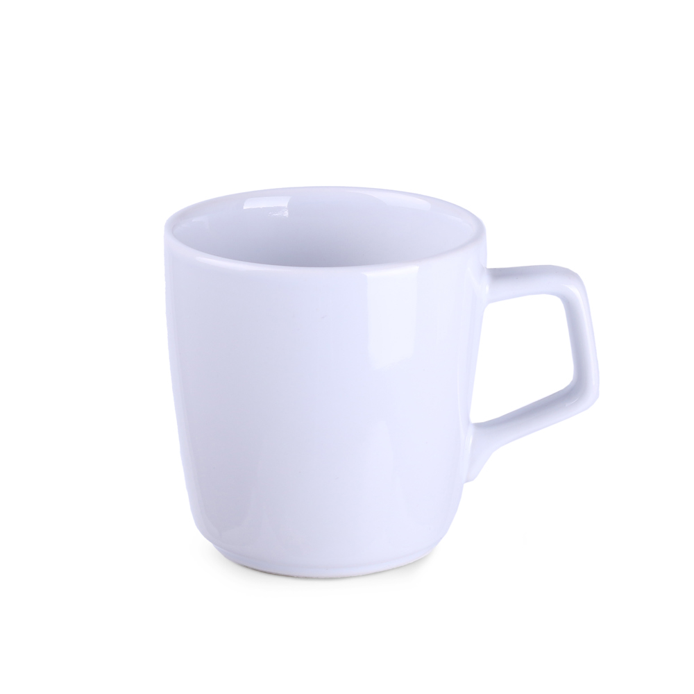 Porzellanbecher mit konvexer Form. Er hat einen originellen, auffälligen Henkel und umfangreiche Möglichkeiten zur Einfärbung.