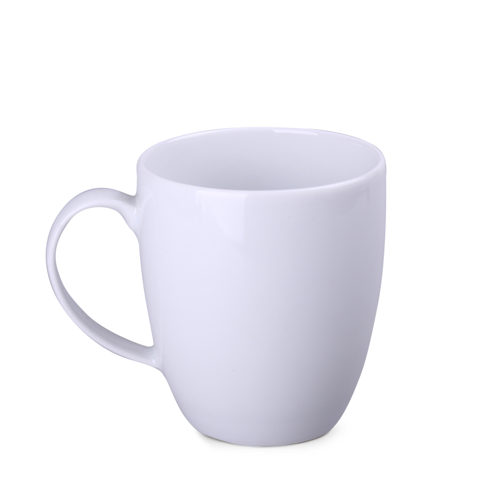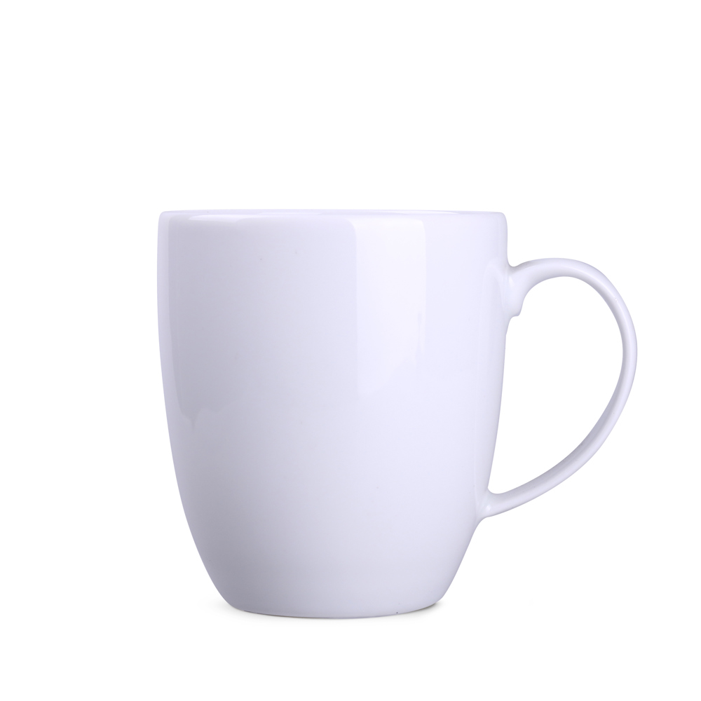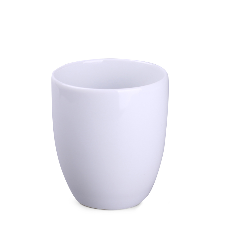 Ein dezenter Becher aus Porzellan. Er hat einen bequemen Griff. Sein elegantes Design bringt die beworbene Marke schön zur Geltung.
