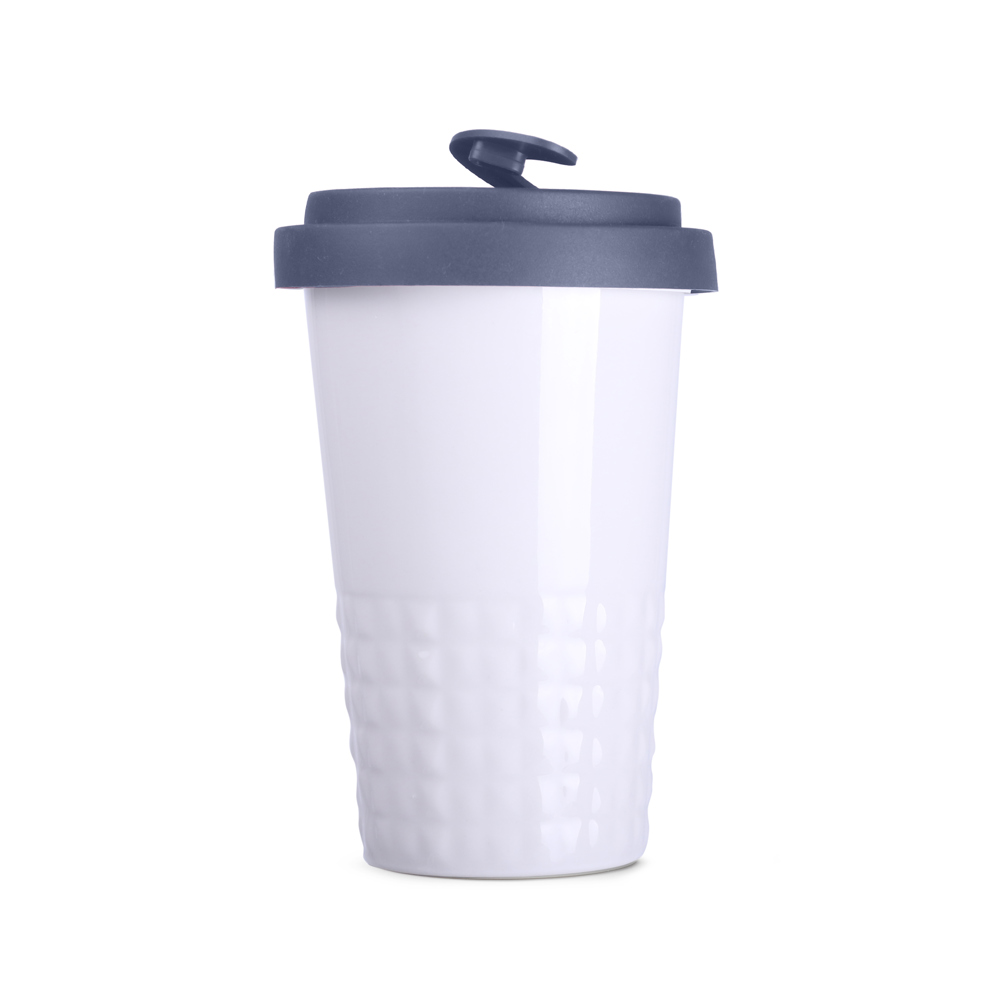 Mobiler Designer-Becher aus Porzellan. Es hat eine charakteristische Oberfläche des unteren Teils in Form einer geometrischen Struktur. Das Modell ist für aktive Menschen, Liebhaber von Ausflügen und Reisen bestimmt. Dank der seltenen inneren Struktur aus doppelten Porzellanwänden zeichnet er sich durch eine erhöhte Wärmeisolierung aus. Er hat einen Deckel mit festem Verschluss, erhältlich in Farben.