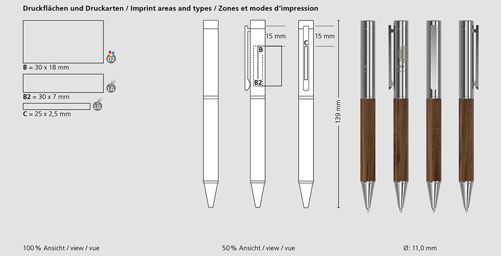 Der Unique wood MMc ist ein Drehkugelschreiber. Materialien und Oberflächen: Spitze: Messing glanzverchromt. Schaft: Nussbaumholz. Oberteil: Messing glanzverchromt. Klipp: Stahl glanzverchromt. Standardfarben: Schaft: Nussbaumholz. Sonderfarben: - Standardmine: Multifill P (8.000 m), blau, Mine optional: Multifill P (schwarz).