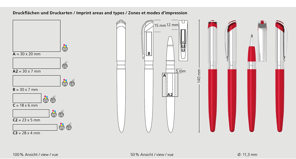 Der I-roq rollerball metal Mc ist ein Tintenroller. Materialien und Oberflächen: Schaft: Messing verchromt, glanzlackiert. Ring und Kappe: Messing glanzverchromt. Klipp: Federstahl glanzverchromt. Standardfarben: Schaft: in 4 Farben erhältlich. Sonderfarben: ab 10.000 Stück, ab 25.000 Stück ohne PMS-Zuschlag. Standardmine: Rollerballmine RO-S (600 - 800 m), blau oder schwarz, Mine optional: