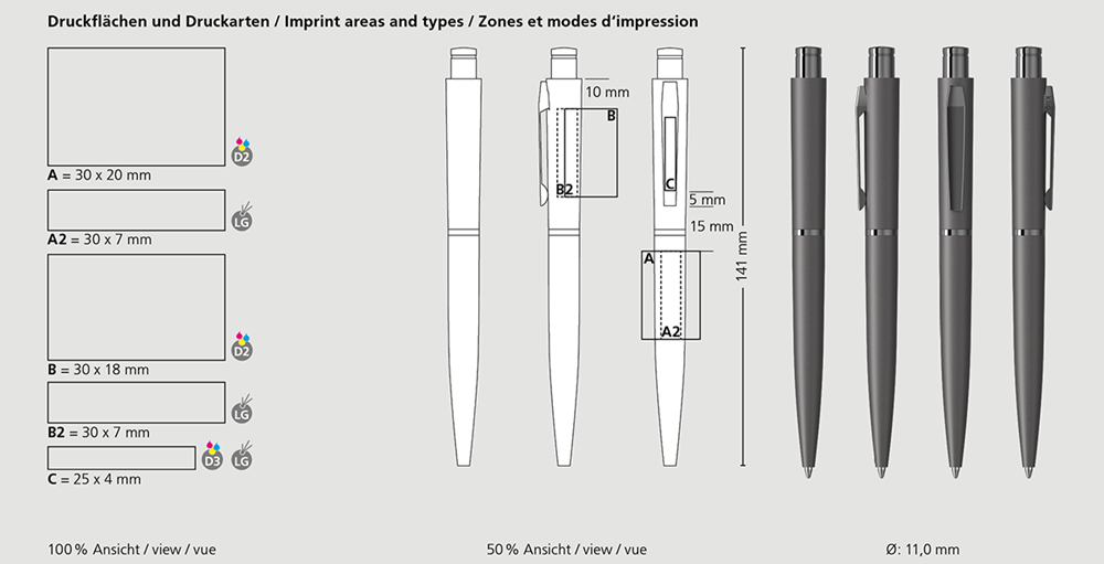 Der Snooker metal Mc ist ein Druckkugelschreiber. Materialien und Oberflächen: Schaft: Aluminium, mattlackierte Oberfläche. Ring und Drücker: Messing glanzverchromt. Oberteil: Aluminium, mattlackierte Oberfläche. Klipp: Stahl glanzverchromt. Standardfarben: Kugelschreiber: in 4 Farben erhältlich. Sonderfarben: ab 10.000 Stück, ab 25.000 Stück ohne PMS-Zuschlag. Standardmine: Multifill P (8.000 m), blau, Mine optional: Multifill P (schwarz).
