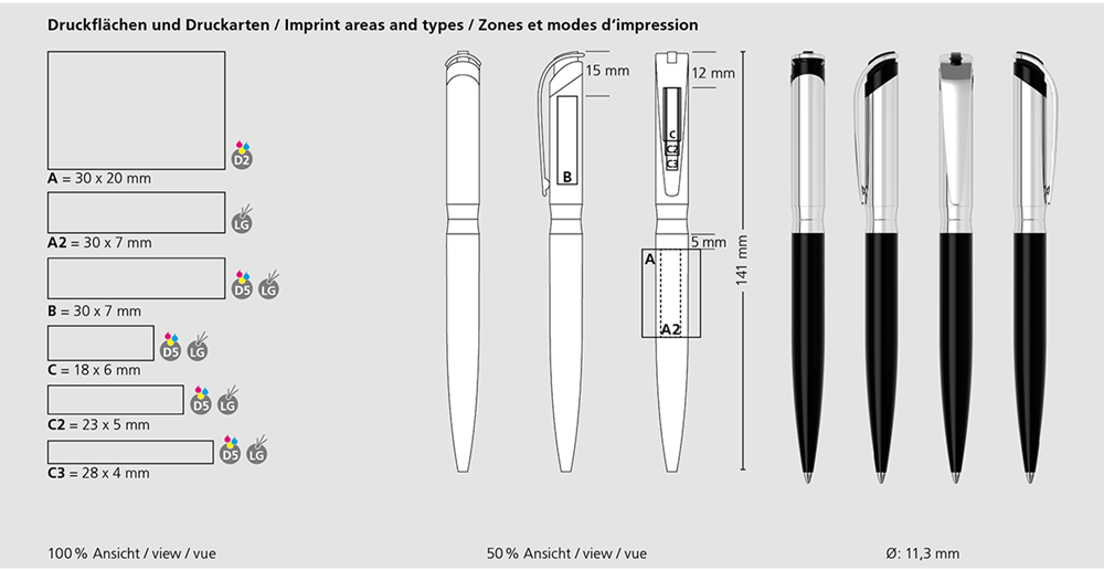Der I-roq metal Mc ist ein Drehkugelschreiber. Materialien und Oberflächen: Schaft: Messing verchromt, glanzlackiert. Ring und Oberteil: Messing glanzverchromt. Klipp: Federstahl glanzverchromt. Standardfarben: Schaft: in 4 Farben erhältlich. Sonderfarben: ab 10.000 Stück, ab 25.000 Stück ohne PMS-Zuschlag. Standardmine: Multifill P (8.000 m), blau, Mine optional: Multifill P (schwarz).