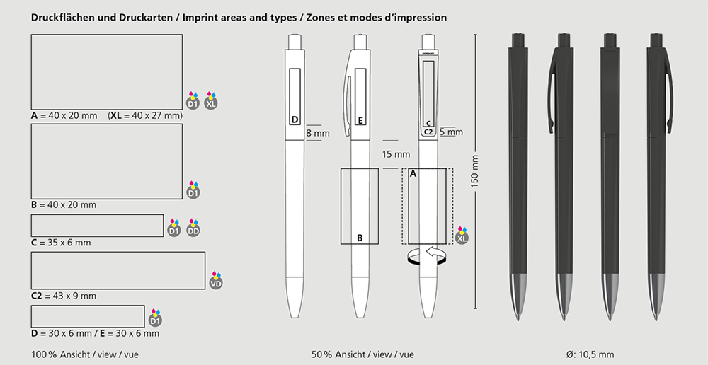 Der Qube high gloss Mn ist ein Druckkugelschreiber. Materialien und Oberflächen: Spitze: Messing vernickelt. Schaft, Oberteil und Drücker: Kunststoff (ABS) hochglänzend. Minenröhrchen: Recyceltes Polypropylen (rPP). Standardfarben: Schaft, Oberteil und Drücker: aus 14 Farben kombinierbar. Sonderfarben: ab 5.000 Stück, ab 25.000 Stück ohne PMS-Zuschlag. Standardmine: Silktech L (3.000 m), blau oder schwarz, Mine optional: Silktech XL, Multifill P, Multi-Gel.