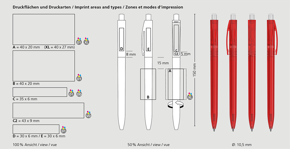 Der Qube transparent ist ein Druckkugelschreiber. Materialien und Oberflächen: Schaft, Oberteil und Drücker: Kunststoff (M-ABS) transparent. Minenröhrchen: Recyceltes Polypropylen (rPP). Standardfarben: Schaft, Oberteil und Drücker: aus 12 Farben kombinierbar. Sonderfarben: ab 5.000 Stück, ab 25.000 Stück ohne PMS-Zuschlag. Standardmine: Silktech L (3.000 m), blau oder schwarz, Mine optional: Silktech XL, Multifill P, Multi-Gel.
