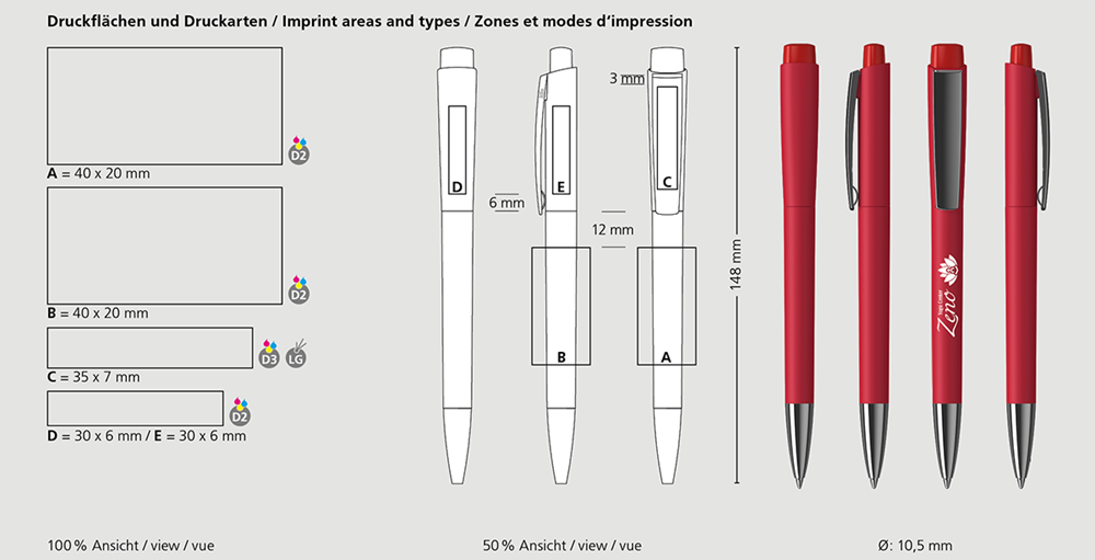 Der Zeno softtouch/high gloss MMn ist ein Druckkugelschreiber. Materialien und Oberflächen: Spitze: Messing vernickelt. Schaft und Oberteil: Kunststoff (ABS), gummierte Softtouch-Oberfläche. Drücker: Kunststoff (ABS) hochglänzend. Klipp: Federstahl vernickelt. Minenröhrchen: Recyceltes Polypropylen (rPP). Standardfarben: Schaft, Oberteil und Drücker: aus 14 Farben kombinierbar. Sonderfarben: ab 5.000 Stück, ab 25.000 Stück ohne PMS-Zuschlag. Standardmine: Silktech L (3.000 m), blau oder schwarz, Mine optional: Silktech XL, Multifill P, Multi-Gel.