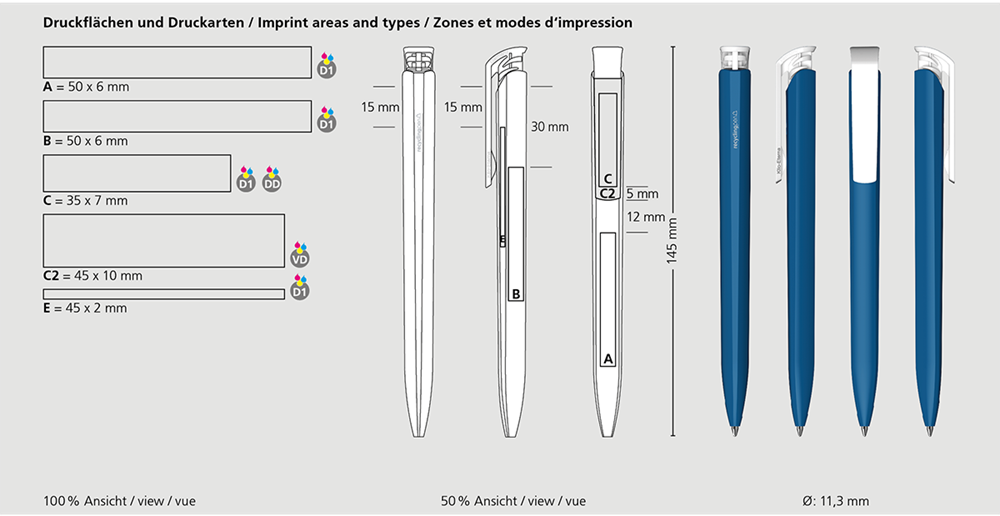 Der Trias recycling ist ein Druckkugelschreiber. Materialien und Oberflächen: Schaft und Drückerklipp: Kunststoff (rABS) hochglänzend, recycelt. Minenröhrchen: Recyceltes Polypropylen (rPP). Standardfarben: Schaft und Drückerklipp: aus 14 Farben kombinierbar. Hinweis: Aufgrund der recycelten Rohstoffe kann es zu Farbabweichungen auch bei einzelnen Bauteilen eines Produktes kommen. Sonderfarben: ab 3.000 Stück, ab 25.000 Stück ohne PMS-Zuschlag. Standardmine: Silktech L (3.000 m), blau oder schwarz, Mine optional: