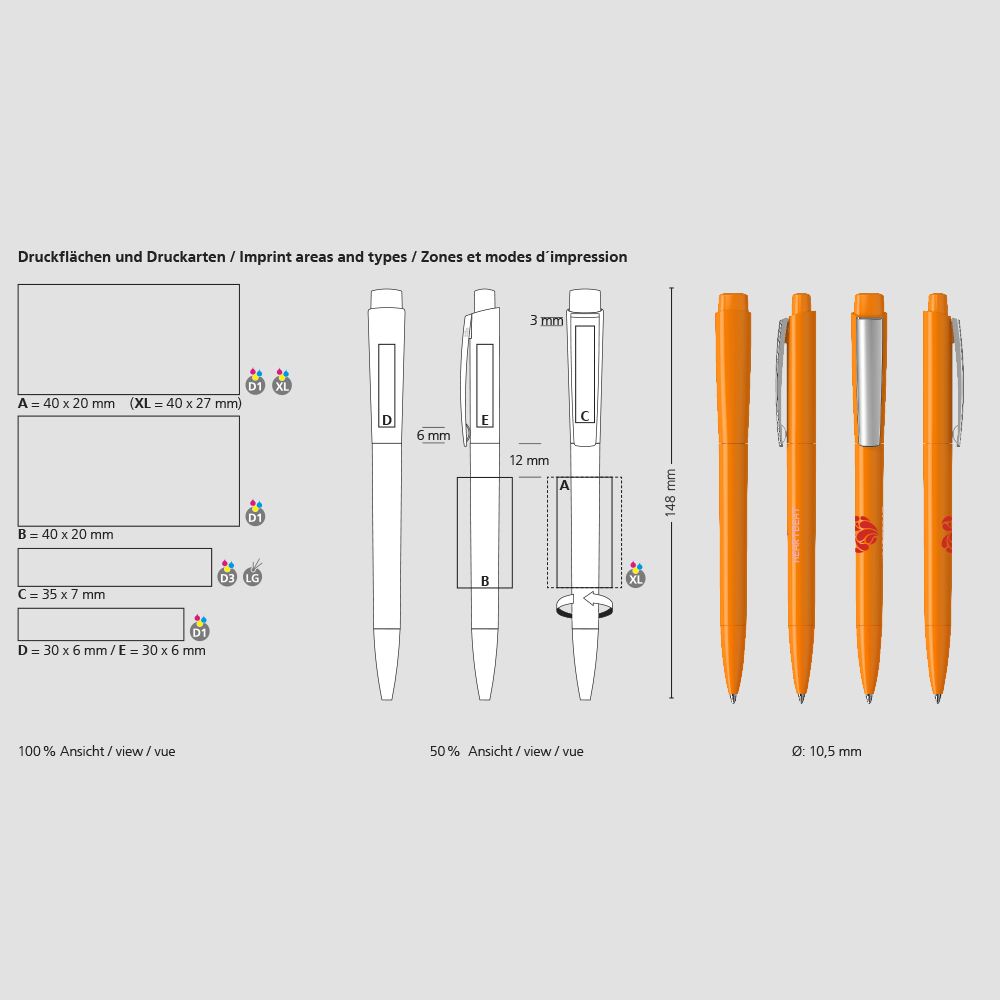 Der Zeno high gloss PMn ist ein Druckkugelschreiber. Materialien und Oberflächen: Spitze, Schaft, Oberteil und Drücker: Kunststoff (ABS) hochglänzend. Klipp: Federstahl vernickelt. Minenröhrchen: Recyceltes Polypropylen (rPP). Standardfarben: Spitze, Schaft, Oberteil und Drücker: aus 14 Farben kombinierbar. Sonderfarben: ab 5.000 Stück, ab 25.000 Stück ohne PMS-Zuschlag. Standardmine: Silktech L (3.000 m), blau oder schwarz, Mine optional: Silktech XL, Multifill P, Multi-Gel.