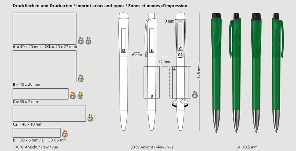 Der Zeno transparent Mn ist ein Druckkugelschreiber. Materialien und Oberflächen: Spitze: Messing vernickelt. Schaft, Oberteil und Drücker: Kunststoff (M-ABS) transparent. Minenröhrchen: Recyceltes Polypropylen (rPP). Standardfarben: Schaft, Oberteil und Drücker: aus 12 Farben kombinierbar. Sonderfarben: ab 3.000 Stück, ab 25.000 Stück ohne PMS-Zuschlag. Standardmine: Silktech L (3.000 m), blau oder schwarz, Mine optional: Silktech XL, Multifill P, Multi-Gel.