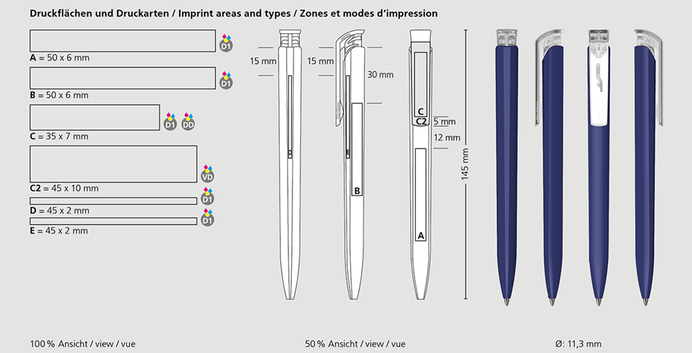 Der Trias high gloss/transparent ist ein Druckkugelschreiber. Materialien und Oberflächen: Schaft: Kunststoff (ABS) hochglänzend. Drückerklipp: Kunststoff (M-ABS) transparent. Minenröhrchen: Recyceltes Polypropylen (rPP). Standardfarben: Schaft: aus 14 Farben kombinierbar. Drückerklipp: aus 12 Farben kombinierbar. Sonderfarben: ab 5.000 Stück, ab 25.000 Stück ohne PMS-Zuschlag. Standardmine: Silktech L (3.000 m), blau oder schwarz, Mine optional: