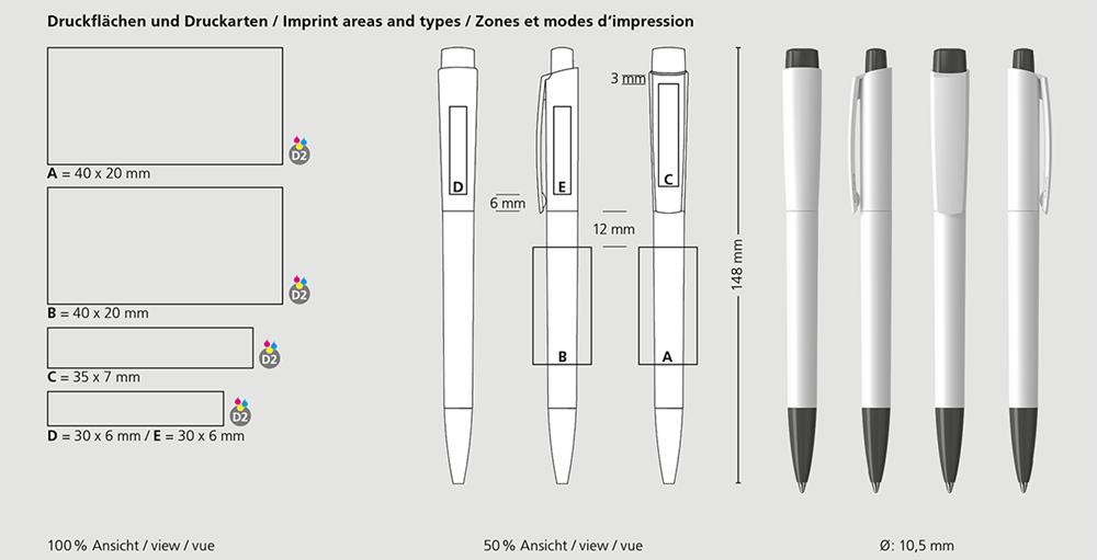 Der Zeno softtouch/high gloss ist ein Druckkugelschreiber. Materialien und Oberflächen: Spitze: Kunststoff (ABS) hochglänzend. Schaft und Oberteil: Kunststoff (ABS), gummierte Softtouch-Oberfläche. Drücker: Kunststoff (ABS) hochglänzend. Minenröhrchen: Recyceltes Polypropylen (rPP). Standardfarben: Spitze, Schaft, Oberteil und Drücker: aus 14 Farben kombinierbar. Sonderfarben: ab 5.000 Stück, ab 25.000 Stück ohne PMS-Zuschlag. Standardmine: Silktech L (3.000 m), blau oder schwarz, Mine optional: Silktech XL, Multifill P, Multi-Gel.