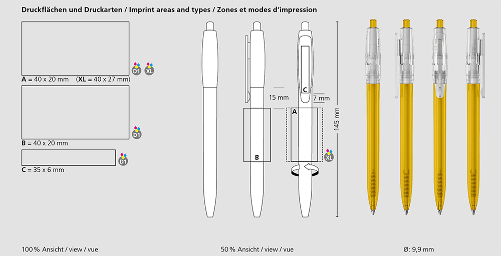 Der Klix transparent ist ein Druckkugelschreiber. Materialien und Oberflächen: Schaft, Oberteil und Drücker: Kunststoff (M-ABS) transparent. Minenröhrchen: Recyceltes Polypropylen (rPP). Standardfarben: Schaft, Oberteil und Drücker: aus 12 Farben kombinierbar. Sonderfarben: ab 5.000 Stück, ab 25.000 Stück ohne PMS-Zuschlag. Standardmine: Silktech L (3.000 m), blau oder schwarz, Mine optional: Silktech XL, Multifill P, Multi-Gel.