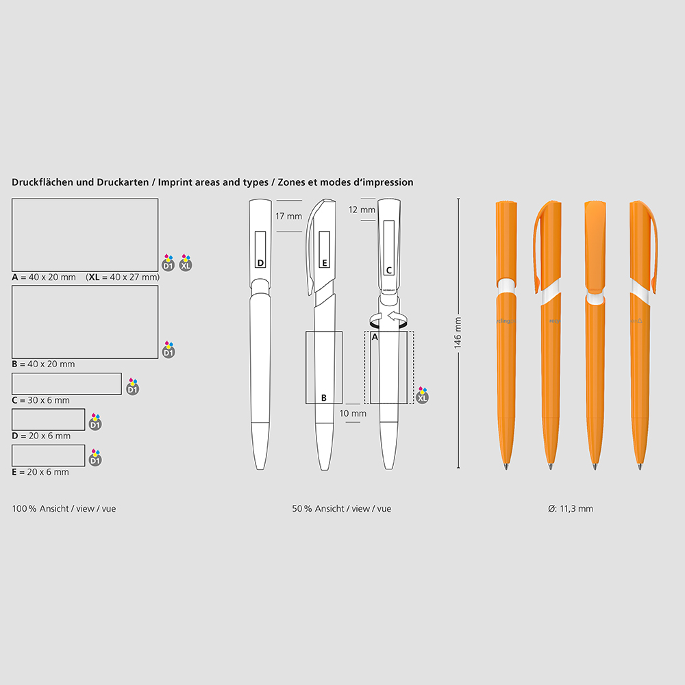Der Push recycling ist ein Druckkugelschreiber. Materialien und Oberflächen: Spitze, Schaft, Hülse und Drückerklipp: Kunststoff (rABS) hochglänzend, Minenröhrchen: Recyceltes Polypropylen (rPP). Standardfarben: Spitze, Schaft, Hülse und Oberteil: aus 14 Farben kombinierbar. Sonderfarben: ab 5.000 Stück, ab 25.000 Stück ohne PMS-Zuschlag. Standardmine: Silktech L (3.000 m), blau oder schwarz, Mine optional: Silktech XL, Multifill P, Multi-Gel.