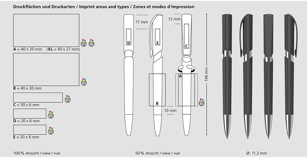 Der Push high gloss Mn ist ein Druckkugelschreiber. Materialien und Oberflächen: Spitze: Messing vernickelt. Schaft: Kunststoff (ABS) hochglänzend. Hülse: Metallisiert. Drückerklipp: Kunststoff (ABS) hochglänzend. Minenröhrchen: Recyceltes Polypropylen (rPP). Standardfarben: Schaft und Oberteil: aus 14 Farben kombinierbar. Sonderfarben: ab 5.000 Stück, ab 25.000 Stück ohne PMS-Zuschlag. Standardmine: Silktech L (3.000 m), blau oder schwarz, Mine optional: Silktech XL, Multifill P, Multi-Gel.