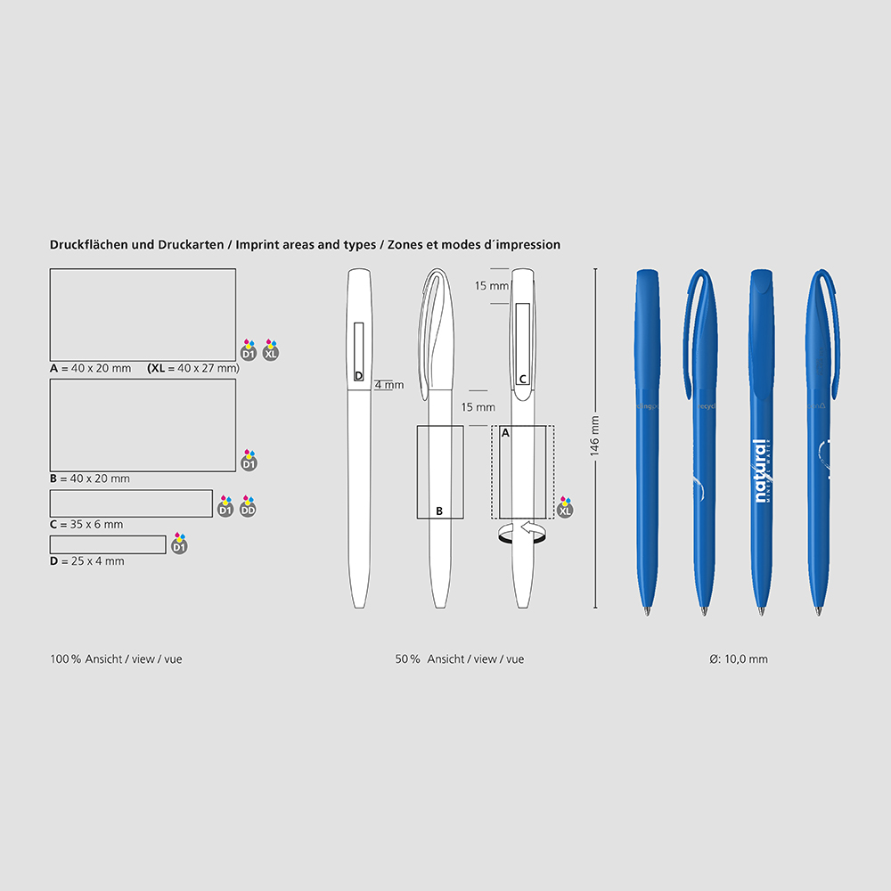 Der Boa recycling ist ein Drehkugelschreiber. Materialien und Oberflächen: Schaft und Oberteil: Kunststoff (rABS) hochglänzend, recycelt. Oberteil: Mix aus matten und glänzenden Flächen. Minenröhrchen: Recyceltes Polypropylen (rPP). Standardfarben: Schaft und Oberteil: aus 14 Farben kombinierbar. Hinweis: Aufgrund der recycelten Rohstoffe kann es zu Farbabweichungen auch bei einzelnen Bauteilen eines Produktes kommen. Sonderfarben: ab 3.000 Stück, ab 25.000 Stück ohne PMS-Zuschlag. Standardmine: Silktech L (3.000 m), blau oder schwarz, Mine optional: Silktech XL, Multifill P, Multi-Gel.