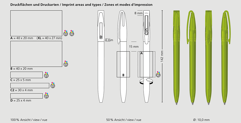 Der Cobra transparent ist ein Drehkugelschreiber. Materialien und Oberflächen: Schaft, Oberteil und Klipp: Kunststoff (M-ABS) transparent. Minenröhrchen: Recyceltes Polypropylen (rPP). Standardfarben: Schaft, Oberteil und Klipp: aus 12 Farben kombinierbar. Sonderfarben: ab 5.000 Stück, ab 25.000 Stück ohne PMS-Zuschlag. Standardmine: Silktech L (3.000 m), blau oder schwarz, Mine optional: Silktech XL, Multifill P, Multi-Gel.