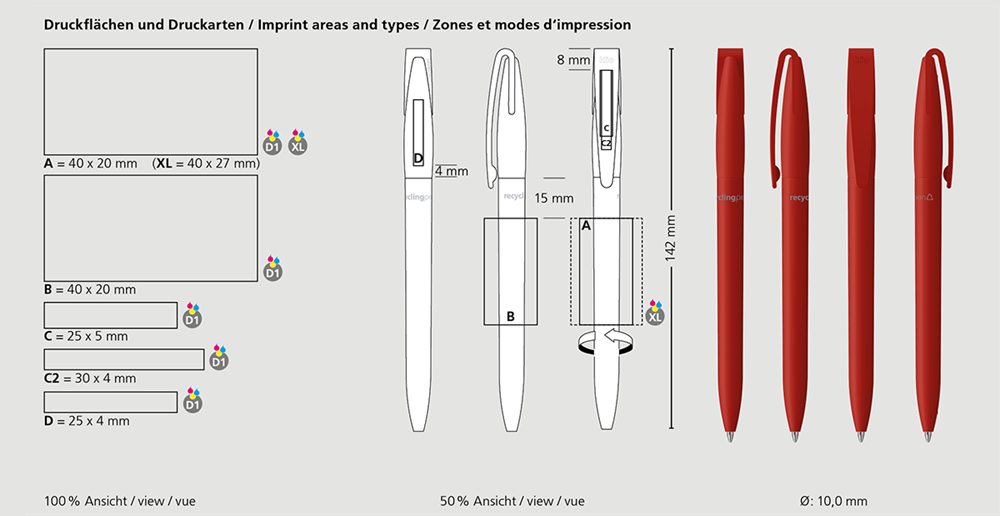 Der Cobra matt recycling ist ein Drehkugelschreiber. Materialien und Oberflächen: Schaft, Oberteil und Klipp: Kunststoff (rABS) matt, recycelt. Minenröhrchen: Recyceltes Polypropylen (rPP). Standardfarben: Schaft, Oberteil und Klipp: aus 14 Farben kombinierbar. Hinweis: Aufgrund der recycelten Rohstoffe kann es zu Farbabweichungen auch bei einzelnen Bauteilen eines Produktes kommen. Sonderfarben: ab 5.000 Stück, ab 25.000 Stück ohne PMS-Zuschlag. Standardmine: Silktech L (3.000 m), blau oder schwarz, Mine optional: Silktech XL, Multifill P, Multi-Gel.