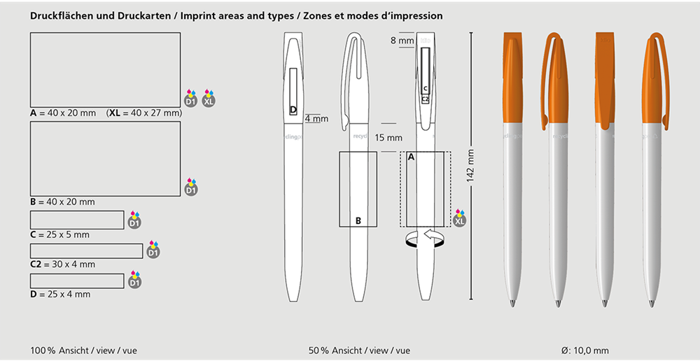 Der Cobra recycling ist ein Drehkugelschreiber. Materialien und Oberflächen: Schaft, Oberteil und Klipp: Kunststoff (rABS) hochglänzend, recycelt. Minenröhrchen: Recyceltes Polypropylen (rPP). Standardfarben: Schaft, Oberteil und Klipp: aus 14 Farben kombinierbar. Hinweis: Aufgrund der recycelten Rohstoffe kann es zu Farbabweichungen auch bei einzelnen Bauteilen eines Produktes kommen. Sonderfarben: ab 5.000 Stück, ab 25.000 Stück ohne PMS-Zuschlag. Standardmine: Silktech L (3.000 m), blau oder schwarz, Mine optional: Silktech XL, Multifill P, Multi-Gel.