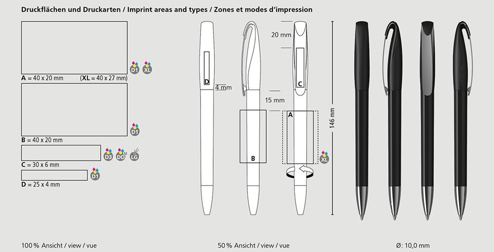 Der Boa high gloss MMn ist ein Drehkugelschreiber. Materialien und Oberflächen: Spitze: Messing vernickelt. Schaft und Oberteil: Kunststoff (ABS) hochglänzend, Oberteil: Mix aus matten und glänzenden Flächen. Klipp: Federstahl vernickelt. Minenröhrchen: Recyceltes Polypropylen (rPP). Standardfarben: Schaft und Oberteil: aus 14 Farben kombinierbar. Sonderfarben: ab 5.000 Stück, ab 25.000 Stück ohne PMS-Zuschlag. Standardmine: Silktech L (3.000 m), blau oder schwarz, Mine optional: Silktech XL, Multifill P, Multi-Gel.