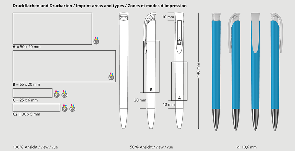 Der Jona softtouch/high gloss Mn ist ein Druckkugelschreiber. Materialien und Oberflächen: Spitze: Messing vernickelt. Schaft: Kunststoff (ABS), gummierte Softtouch-Oberfläche. Drückerklipp: Kunststoff (ABS) hochglänzend. Minenröhrchen: Recyceltes Polypropylen (rPP). Standardfarben: Schaft und Drückerklipp: aus 14 Farben kombinierbar. Sonderfarben: ab 5.000 Stück, ab 25.000 Stück ohne PMS-Zuschlag. Standardmine: Silktech L (3.000 m), blau oder schwarz, Mine optional: Silktech XL, Multifill P, Multi-Gel.
