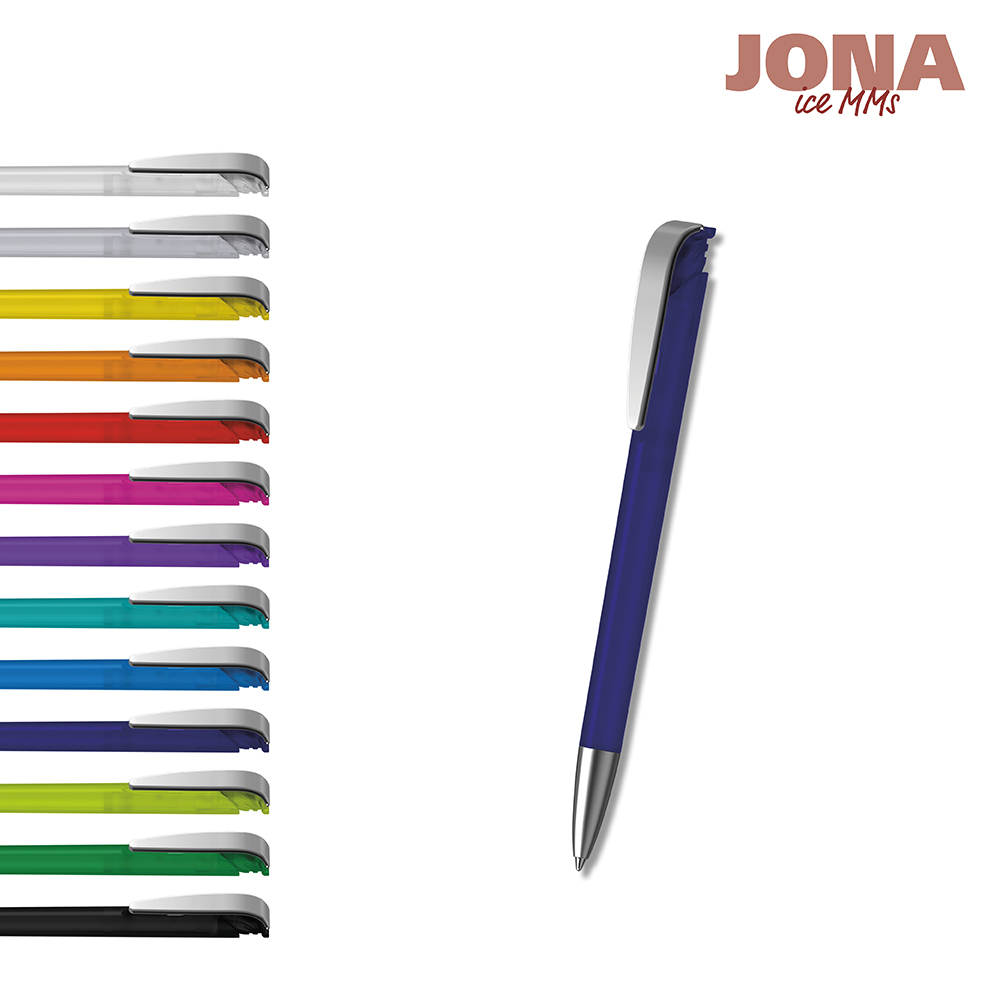 Der Jona ice MMs ist ein Druckkugelschreiber. Materialien und Oberflächen: Spitze: Messing mattverchromt. Schaft und Drücker: Kunststoff (M-ABS) gefrostet. Klipp: Federstahl mattverchromt. Minenröhrchen: Recyceltes Polypropylen (rPP). Standardfarben: Schaft und Drücker: aus 12 Farben kombinierbar. Sonderfarben: ab 5.000 Stück, ab 25.000 Stück ohne PMS-Zuschlag. Standardmine: Silktech L (3.000 m), blau oder schwarz, Mine optional: Silktech XL, Multifill P, Multi-Gel.