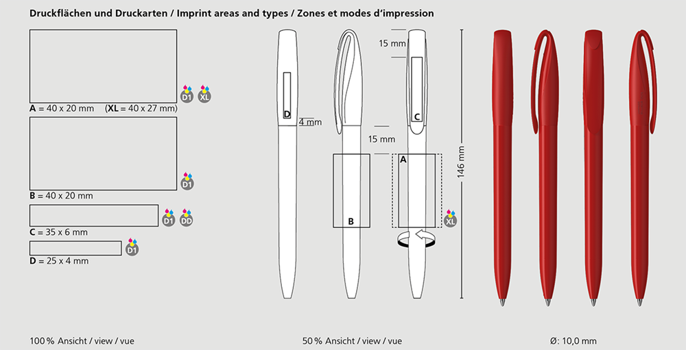 Der Boa high gloss ist ein Drehkugelschreiber. Materialien und Oberflächen: Schaft und Oberteil: Kunststoff (ABS) hochglänzend, Oberteil: Mix aus matten und glänzenden Flächen. Minenröhrchen: Recyceltes Polypropylen (rPP). Standardfarben: Schaft und Oberteil: aus 14 Farben kombinierbar. Sonderfarben: ab 3.000 Stück, ab 25.000 Stück ohne PMS-Zuschlag. Standardmine: Silktech L (3.000 m), blau oder schwarz, Mine optional: Silktech XL, Multifill P, Multi-Gel.