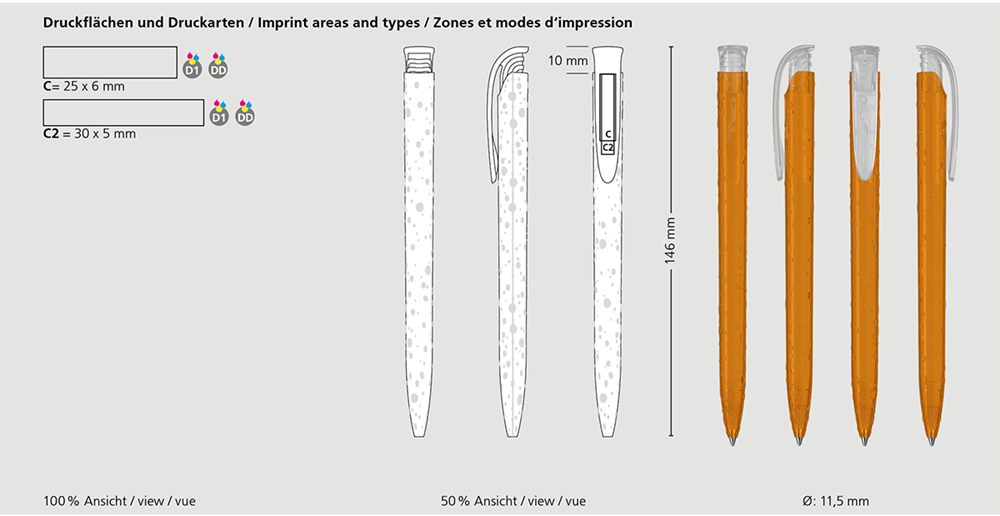 Der Jona drops/transparent ist ein Druckkugelschreiber. Materialien und Oberflächen: Schaft und Drückerklipp: Kunststoff (M-ABS) transparent, Schaft: Struktur in Tropfenoptik. Minenröhrchen: Recyceltes Polypropylen (rPP). Standardfarben: Schaft und Drückerklipp: aus 4 Farben kombinierbar. Sonderfarben: ab 5.000 Stück, ab 25.000 Stück ohne PMS-Zuschlag. Standardmine: Silktech L (3.000 m), blau oder schwarz, Mine optional: Silktech XL, Multifill P, Multi-Gel.