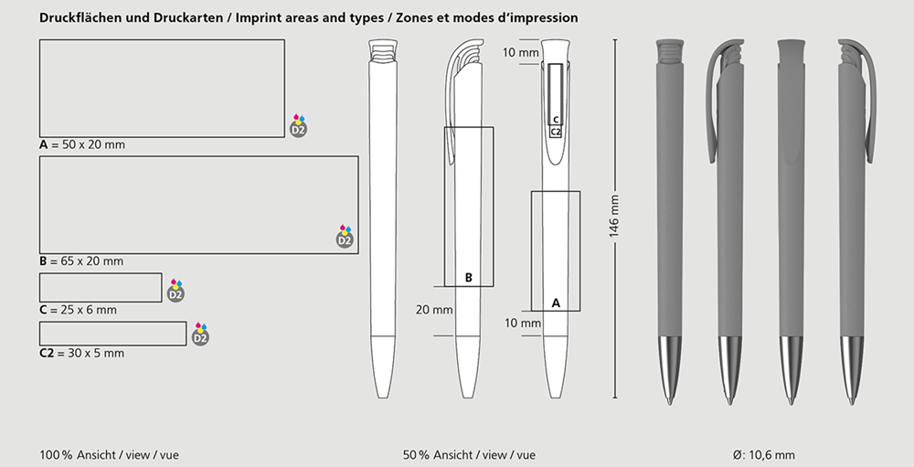 Der Jona softgrip Ms ist ein Druckkugelschreiber. Materialien und Oberflächen: Spitze: Messing mattverchromt. Schaft und Drückerklipp: Kunststoff (ABS), lackierte Softgrip-Oberfläche. Minenröhrchen: Recyceltes Polypropylen (rPP). Standardfarben: Schaft und Drückerklipp: aus 3 Farben kombinierbar. Sonderfarben: - Standardmine: Silktech L (3.000 m), blau oder schwarz, Mine optional: Silktech XL, Multifill P, Multi-Gel.