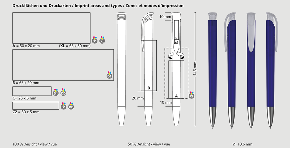 Der Jona ice Ms ist ein Druckkugelschreiber. Materialien und Oberflächen: Spitze: Messing mattverchromt. Schaft und Drückerklipp: Kunststoff (M-ABS) gefrostet. Minenröhrchen: Recyceltes Polypropylen (rPP). Standardfarben: Schaft und Drückerklipp: aus 12 Farben kombinierbar. Sonderfarben: ab 5.000 Stück, ab 25.000 Stück ohne PMS-Zuschlag. Standardmine: Silktech L (3.000 m), blau oder schwarz, Mine optional: Silktech XL, Multifill P, Multi-Gel.