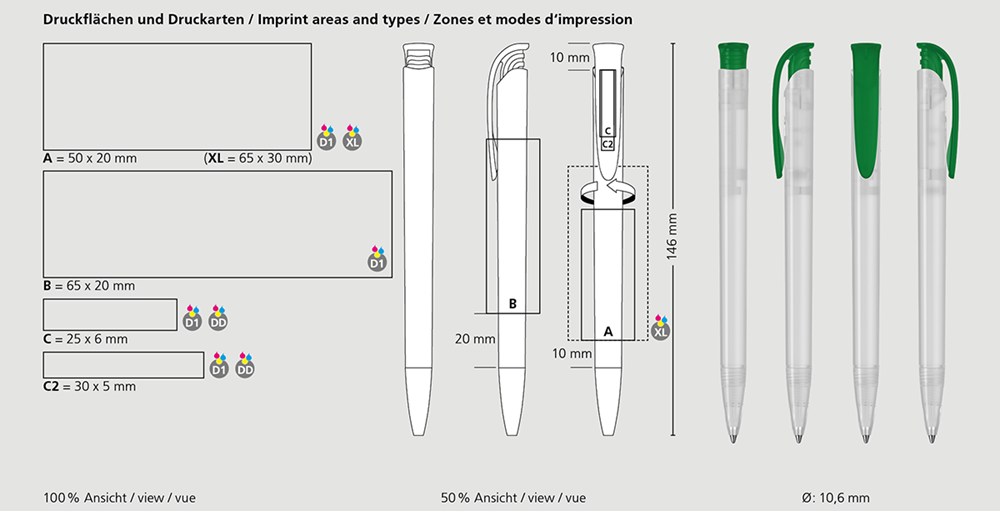 Der Jona ice ist ein Druckkugelschreiber. Materialien und Oberflächen: Spitze, Schaft und Drückerklipp: Kunststoff (M-ABS) gefrostet. Minenröhrchen: Recyceltes Polypropylen (rPP). Standardfarben: Spitze, Schaft und Drückerklipp: aus 12 Farben kombinierbar. Sonderfarben: ab 5.000 Stück, ab 25.000 Stück ohne PMS-Zuschlag. Standardmine: Silktech L (3.000 m), blau oder schwarz, Mine optional: Silktech XL, Multifill P, Multi-Gel.