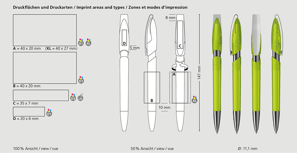 Der Rodeo transparent MMn ist ein Druckkugelschreiber. Materialien und Oberflächen: Spitze: Messing vernickelt. Schaft: Kunststoff (M-ABS) transparent. Hülse: Metallisiert. Oberteil: Kunststoff (M-ABS) transparent. Klipp: Federstahl vernickelt. Minenröhrchen: Recyceltes Polypropylen (rPP). Standardfarben: Schaft und Oberteil: aus 12 Farben kombinierbar. Sonderfarben: ab 5.000 Stück, ab 25.000 Stück ohne PMS-Zuschlag. Standardmine: Silktech L (3.000 m), blau oder schwarz, Mine optional: Silktech XL, Multifill P, Multi-Gel.
