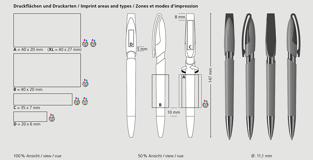 Der Rodeo high gloss Mn ist ein Druckkugelschreiber. Materialien und Oberflächen: Spitze: Messing vernickelt. Schaft: Kunststoff (ABS) hochglänzend. Hülse: Metallisiert. Oberteil und Klipp: Kunststoff (ABS) hochglänzend. Minenröhrchen: Recyceltes Polypropylen (rPP). Standardfarben: Schaft, Oberteil und Klipp: aus 14 Farben kombinierbar. Sonderfarben: ab 5.000 Stück, ab 25.000 Stück ohne PMS-Zuschlag. Standardmine: Silktech L (3.000 m), blau oder schwarz, Mine optional: Silktech XL, Multifill P, Multi-Gel.