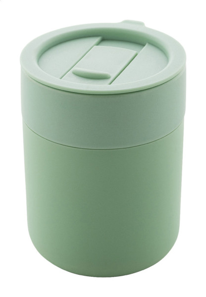 Reisebecher aus Keramik mit Silikonummantelung mit Trinkdeckel aus PP Kunststoff. Füllmenge: 300 ml.