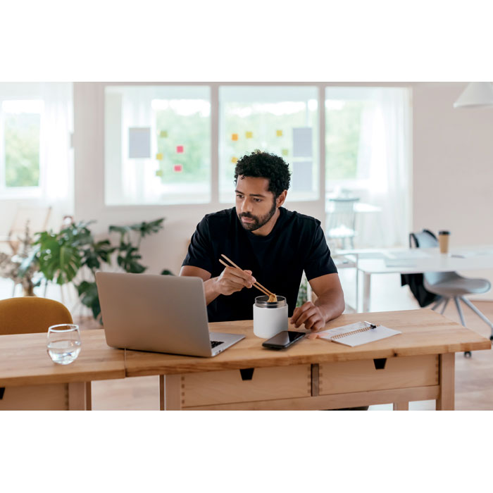 Doppelwandiger isolierter Lunch-Behälter aus recyceltem Edelstahl (90 % recycelter Edelstahl und 10 % Edelstahl) mit PP-Deckel. Füllmenge: 500 ml.