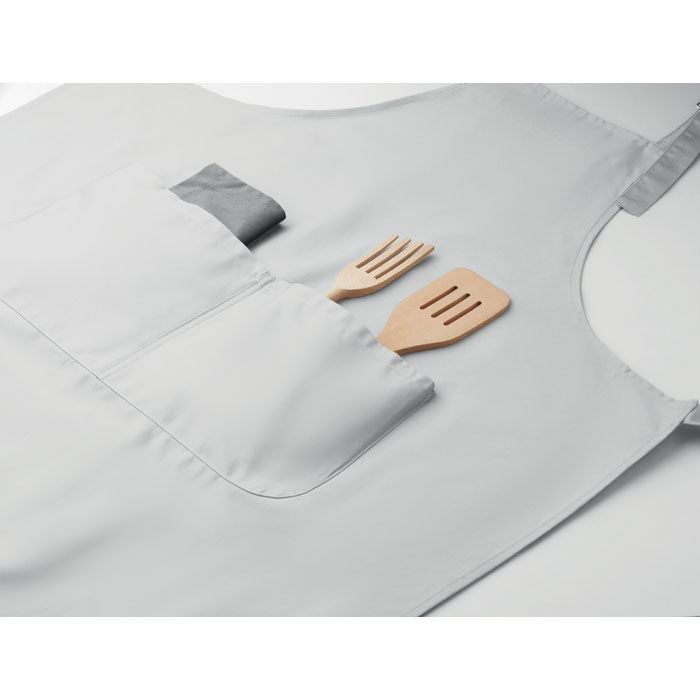 Lange, verstellbare Küchenschürze aus 240 g/m² Polycotton (35% Baumwolle, 65% Polyester) mit zwei Fronttaschen und verstellbarem Gurt mit Metallschnalle.