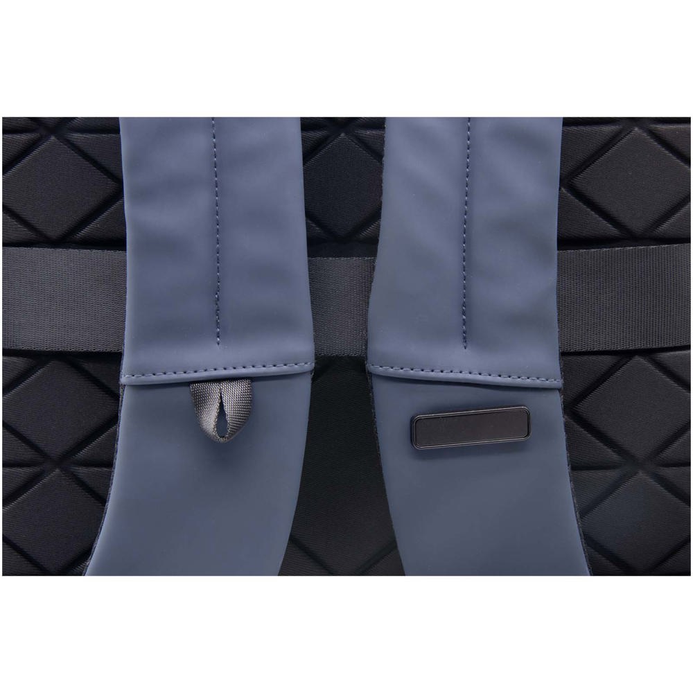 Rucksack aus recyceltem PU und PET Kunststoff, mit gepolsterten Fächern für Laptop oder Tablet sowie integrierten USB-/Type-C-Anschlüssen und Micro-USB-Adapter. Durch den Anschluss einer Powerbank (optional) in der dafür vorgesehenen Tasche verwandelt sich der Rucksack in eine mobile Ladestation. Er lässt sich mit einer magnetischen Frontklappe sowie wasserdichten Reißverschlüssen verschließen. Dank seines strukturierten Designs und des gepolsterten Bodens ist der Inhalt optimal geschützt. Mit Logo-Platte aus Metall an der Vorderseite, Vlies-Aufbewahrungstasche und 3 Jahren Garantie.