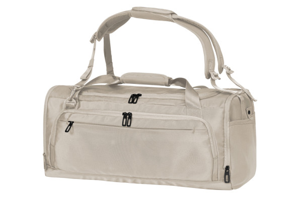komfortable Sport- und Reisetasche mit Rucksackfunktion; recycelter Oberstoff; großes Hauptfach mit 2-Wege-Reißverschlussöffnung; seitliche Reißverschluss-Tasche inklusive Schuhbeutel; Vorderseite: große Vortasche mit 2-Wege-Reißverschluss sowie flache Reißverschluss-Tasche; Innen: hängender Reißverschluss-Organizer und geräumiges Reißverschluss-Deckelfach; gepolsterter Boden; Netzseitentasche zur Aufbewahrung der abnehmbaren, versenkbaren und gepolsterten Träger – ergonomisch geformt und wahlweise als Rucksack- oder Schulterträger nutzbar; Tragegriffe mit gepolsterter Griffmanschette