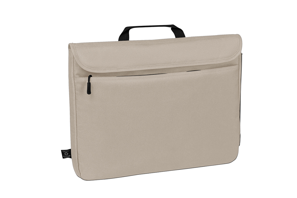 elegante Laptop-Mappe mit recyceltem Oberstoff; gepolstertes Hauptfach; gepolsterter Deckel mit Klettverschluss; große Vortasche mit Reißverschluss; innen AirTag-Fach; rückseitige Schlaufen zur Befestigung individueller Accessoires, z. B. Schultergurt (nicht im Lieferumfang); ergonomischer Handgriff rückseitig, zur Fixierung am Trolley-Gestänge geeignet; flacher seitlicher Handgriff zum einfachen Herausheben, z. B. aus Rucksäcken