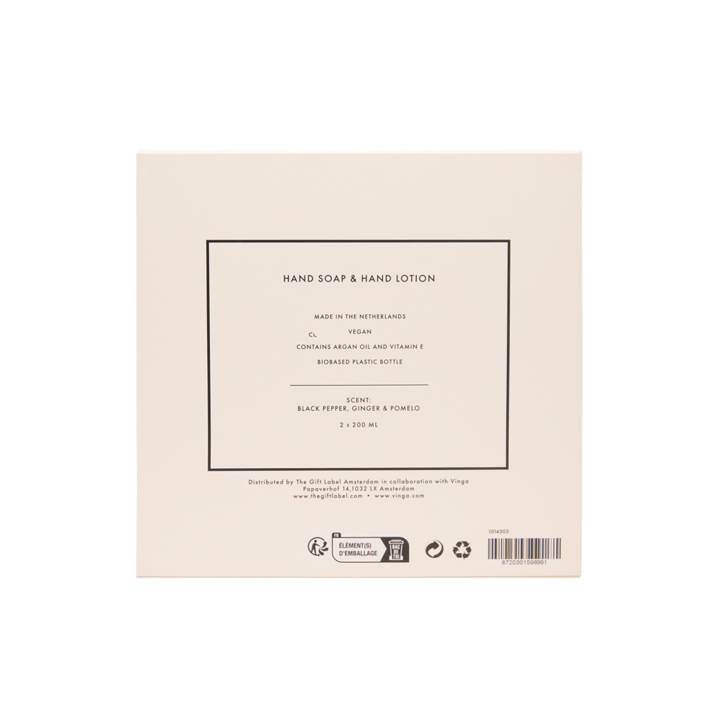 Seidig glatte Hände, jeden Tag. Pflegen Sie Ihre Hände mit diesem wunderbar duftenden unisex Set, bestehend aus zwei 200ml-Flaschen Handseife und Handlotion. Mit dem warmen, spritzigen Aroma von schwarzem Pfeffer, Ingwer und Pomelo hinterlässt es Ihre Hände glatt, gepflegt und dezent parfümiert. Ein Hauch, an den sich die Menschen erinnern werden. Elegant verpackt in einer Geschenkbox in Cremeweiß und Schwarz.